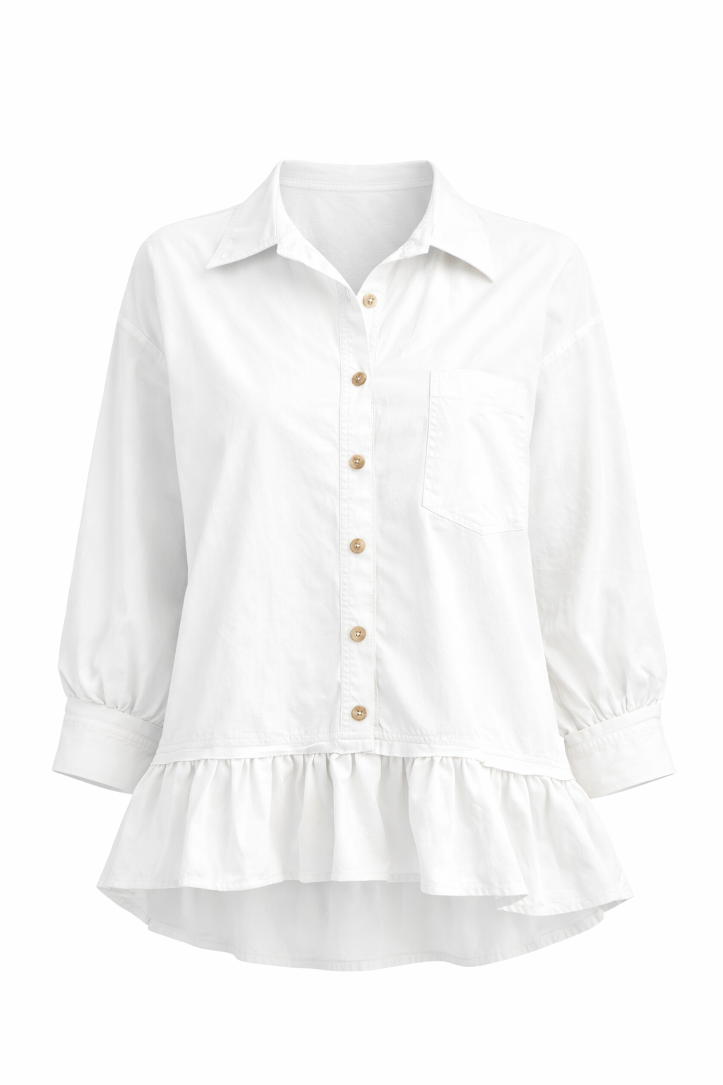 Effortlessly chic meets comfort in this mineral-washed cotton poplin button-down. The relaxed, loose silhouette pairs perfectly with the playful ruffled hem and collared neckline, while 3/4-length sleeves keep things breezy. A single chest pocket adds practical style, and the generous fit makes it your new go-to for laid-back days. Small: 24" length, 24.75" bust.