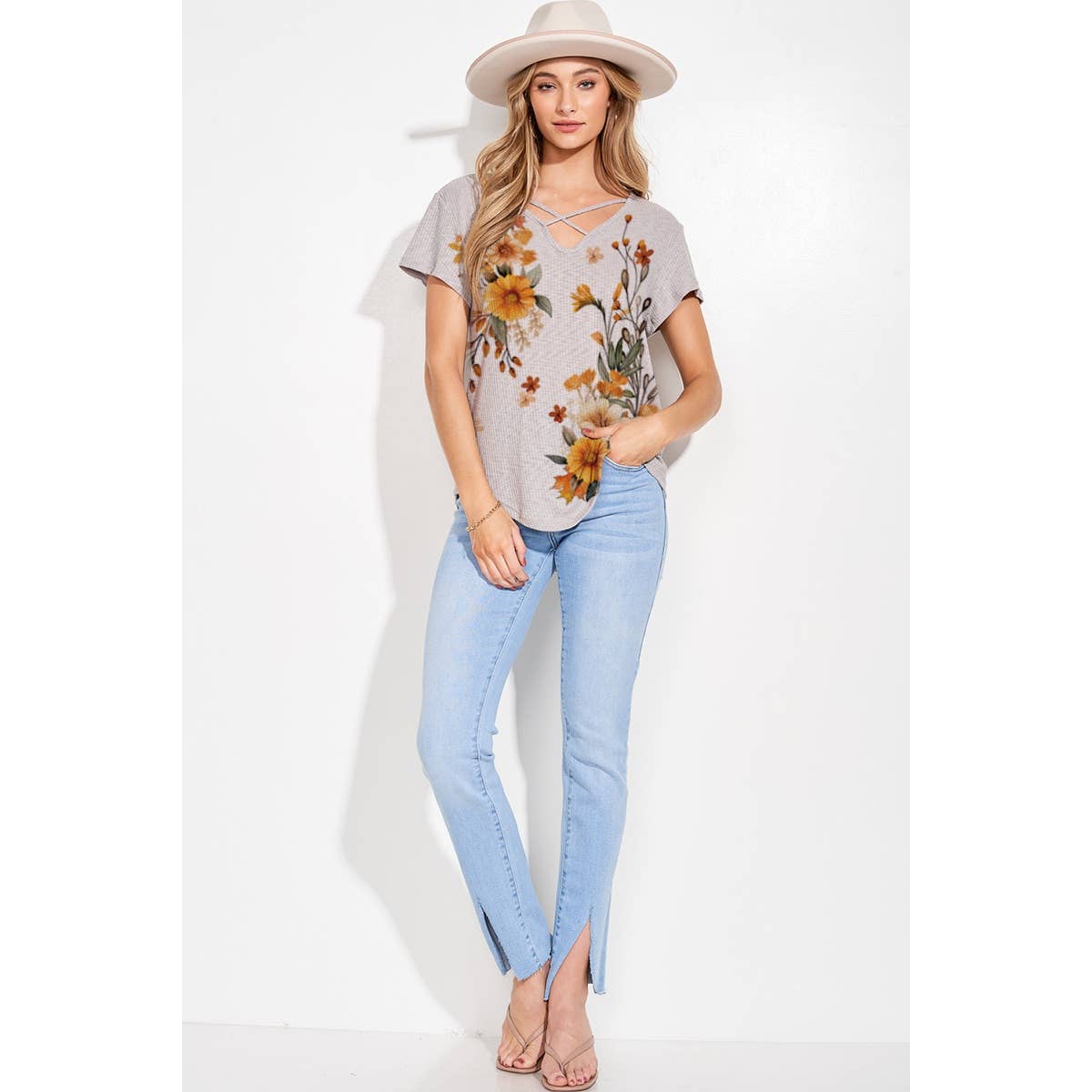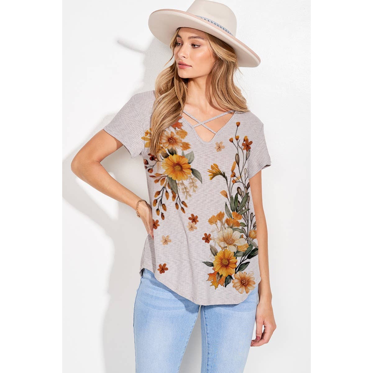 Soft, easy, and beautifully boho — the Golden Meadow Crisscross Tee is made for laid-back days with a touch of western charm. This lightweight neutral top features a flattering relaxed fit, delicate crisscross neckline detail, and a stunning mustard wildflower print that gives all the warm, earthy vibes.