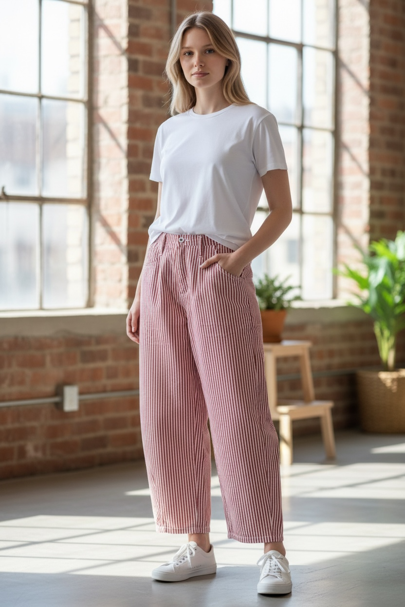 Rock a retro vibe with these striped washed twill barrel pants! The vertical stripe pattern brings personality, while the cropped length and relaxed-yet-tapered silhouette keep things modern and flattering. Functional side pockets and a classic button-zip closure round out the look. Crafted from a breathable cotton-poly blend for all-day comfort. Small: 24.5" inseam, 36" outseam, 14.75" waist.