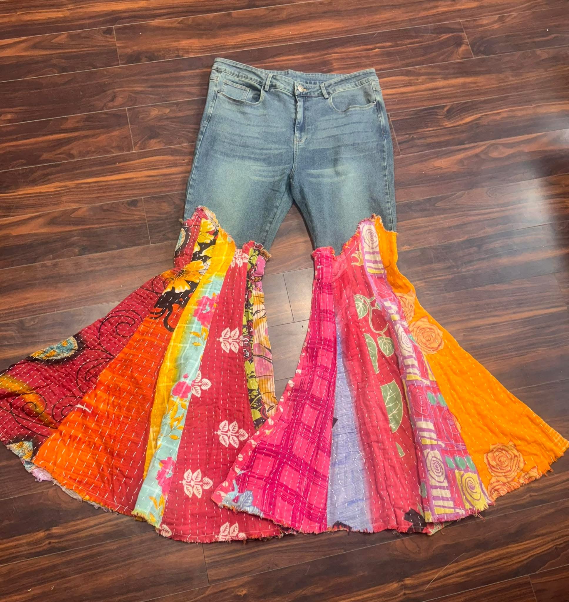 Elevate your denim game with these Got you Covered Kantha Flare Jeans in a moody Jaded Gypsy hue. Featuring intricate kantha embroidery that adds artisanal flair, these flares blend vintage vibes with modern edge. The relaxed silhouette and flowing hem create effortless movement, while the detailed stitching makes every twirl a statement. Perfect for anyone who refuses to blend in—because ordinary is overrated.