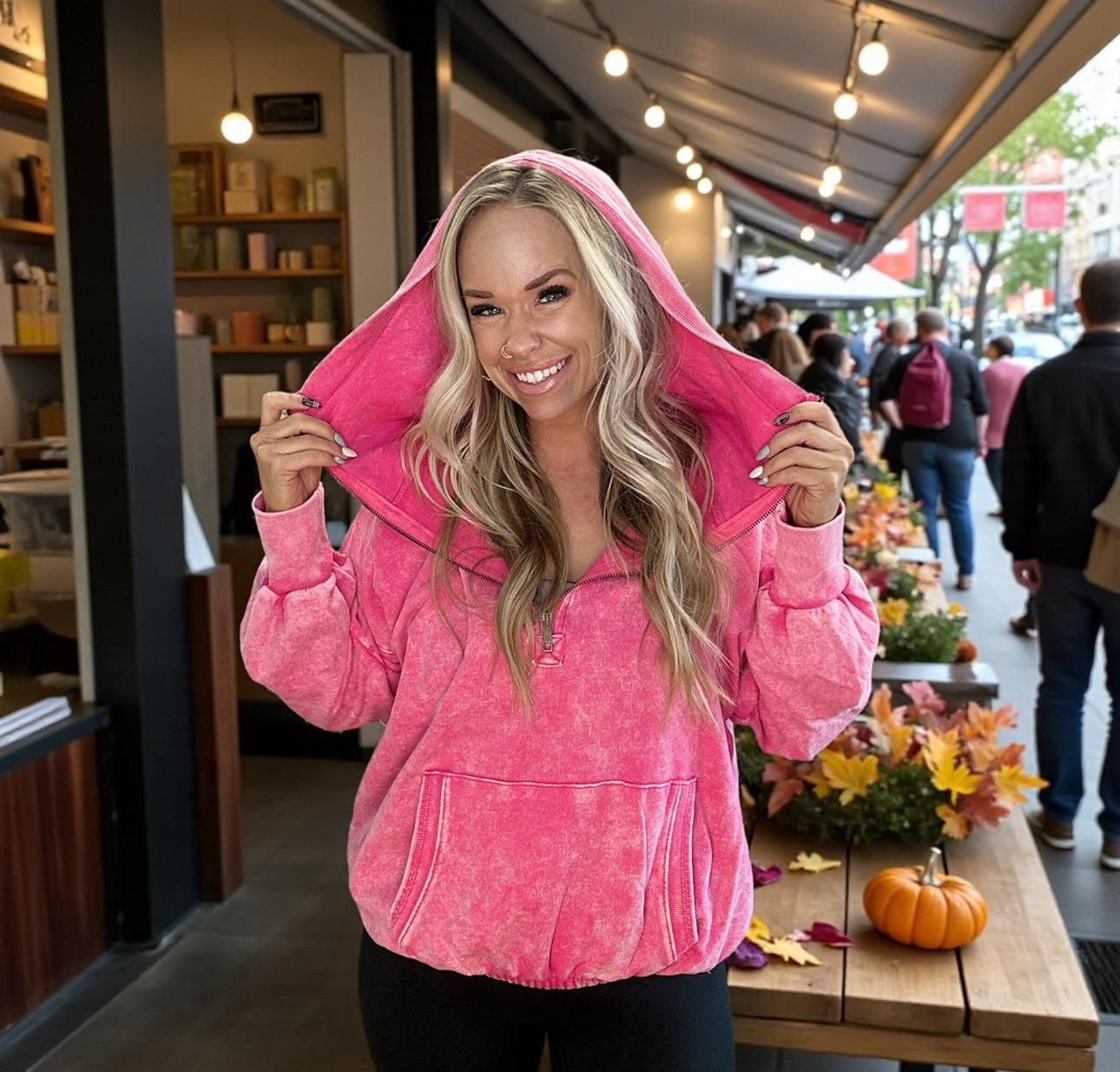 Meet your new throw-on-and-go favorite. The Blush Crush Mineral Wash Hoodie is the perfect mix of cozy, cute, and effortless. Featuring a soft vintage mineral wash in the prettiest pink tone, an oversized relaxed fit, kangaroo pocket, and a flattering half-zip neckline with hood, this piece is made for coffee runs, boutique days, and everything in between.