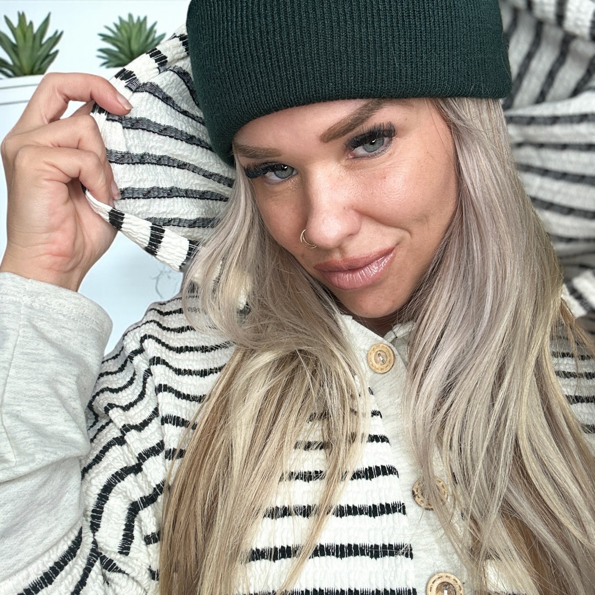 Stay cozy and cool in the Which Way Hoodie by Heimish. This very oversized hoodie features playful stripes and a handy kangaroo pocket for your essentials or to warm your hands. With three stylish Henley buttons and a roomy hood, it’s easy to size down for a snug fit or wear oversized for ultimate comfort and street-ready vibes. Perfect for lounging or making a statement, this hoodie adds a fun twist to your casual collection.  Thumbholes