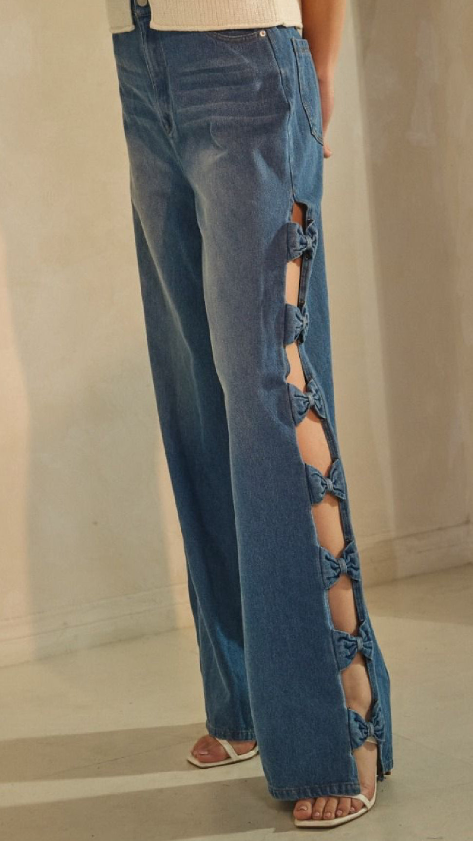 High-waisted wide-leg jeans that make a statement with open side seams tied together with charming denim bows from hip to hem. The playful bow details add movement and personality to a classic silhouette, while the relaxed wide-leg cut offers comfort and style. Crafted from a breathable cotton-polyester blend for durability and ease of wear.