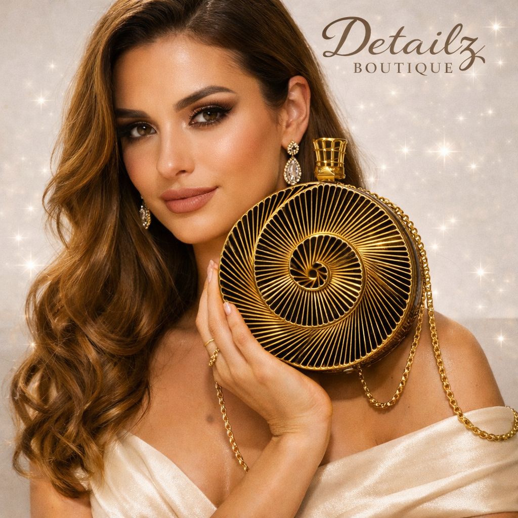 Turn heads with Tourbillon, a handcrafted round metal clutch that captures movement and luxury in one stunning piece. Its front showcases a striking 3D brass pattern with glimpses of the interior, while the back features a crumpled texture with vertical bands for depth. Crafted from pure brass with a 14k gold-electroplated finish, this clutch radiates sophistication. The pebbled frame, sculpted cage-like knob, and clasp-lock closure add refined character. Inside, a suede-lined compartment with a pocket keeps your essentials close—phone, wallet, keys. Includes a detachable gold-tone chain for versatile styling.