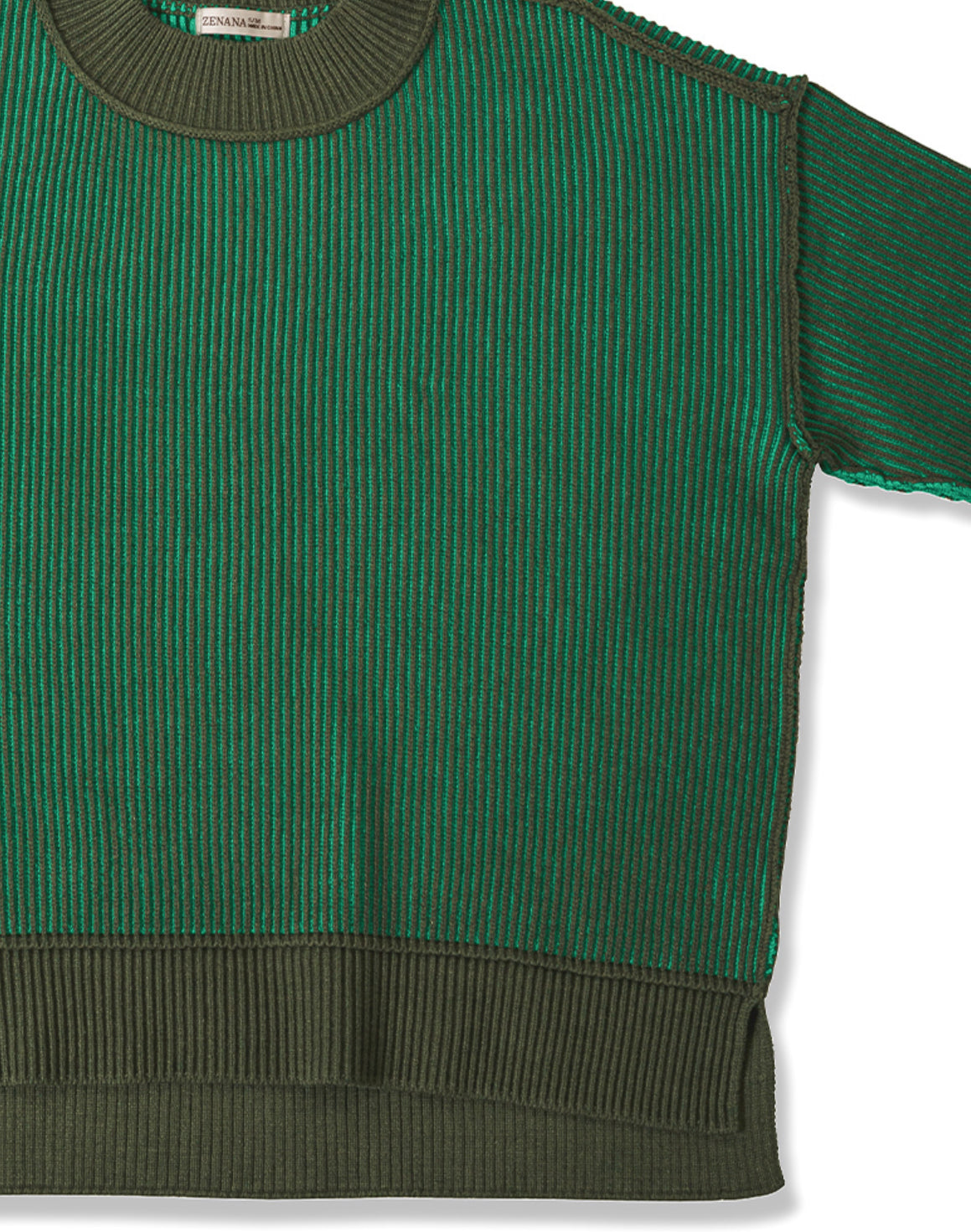 Rock a look that's anything but boring with this two-tone sweater featuring exposed seams and an edgy hi-low silhouette. The side slits add movement and attitude, while the cozy cotton-blend fabric keeps you comfortable all day long. Perfect for layering or wearing solo, this piece brings playful contrast and modern edge to your everyday rotation. Front length hits at 24", back at 25", with a generous 52" chest for the perfect fit.