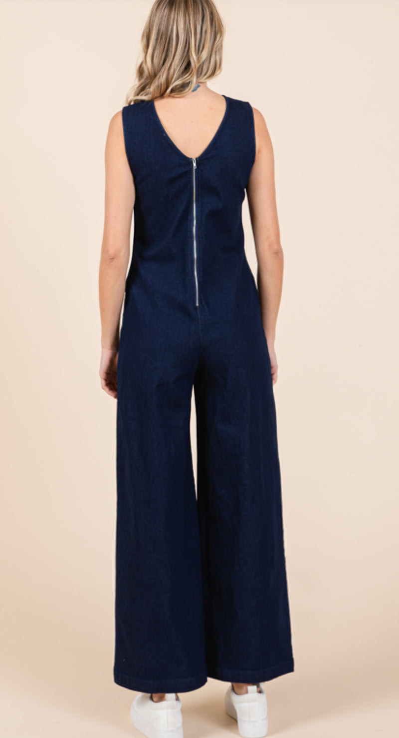 Elevate your style with this chic and comfortable denim jumpsuit, crafted from a stretchy denim fabric for a perfect fit. The flattering V-neck and sleeveless design pair effortlessly with the full-length wide-leg cut for a modern, relaxed look. Featuring patch pockets, a center front seam detail, and a zipper closure on the back for a seamless finish. Whether dressed up or down, this versatile jumpsuit is an easy go-to for any occasion.