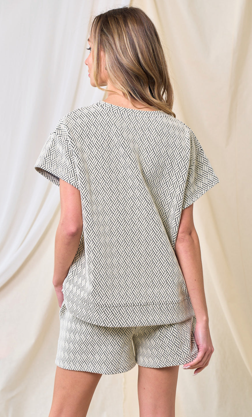 Elevate your loungewear game with this textured short sleeve sweatshirt top that's equal parts cozy and chic. Crafted from a breathable cotton-blend fabric with just the right amount of stretch, it's designed to move with you whether you're relaxing at home or running errands. The textured finish adds visual interest and dimension, making it a versatile layering piece that pairs effortlessly with your favorite bottoms. Perfect for those days when comfort meets style—because looking good shouldn't require any effort.